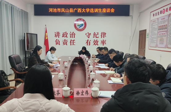 宜州区委组织部部长韦克、凤山县委组织部部长兰昊分别介绍了本地选调生队伍建设、岗位安排、培养历练等情况,对我校选调生在基层治理、乡村振兴等工作中展现出的责任担当与实干精神给予肯定。同时,两位部长结合地方发展需求,坦诚交流了目前工作中存在的痛点难点,并表达了与我校在人才输送、技术支持等方面加强合作的殷切希望。