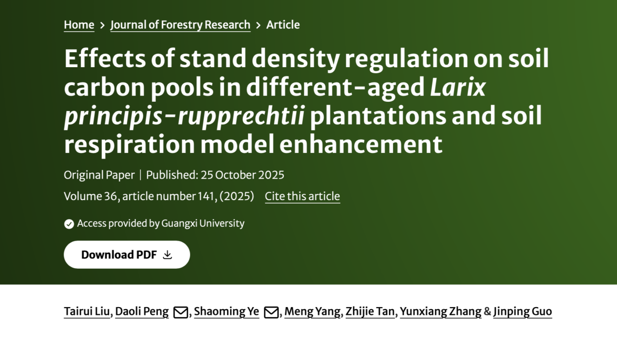 近期,伟德国际1946源于英国刘泰瑞团队在林分密度调控背景下的土壤碳库管理方向取得新成果。研究成果以“Effects of stand density regulation on soil carbon pools in different-agedLarix principis-rupprechtiiplantations and soil respiration model enhancement” 为题发表于中国科学院一区TOP期刊《Journal of Forestry Research》。
