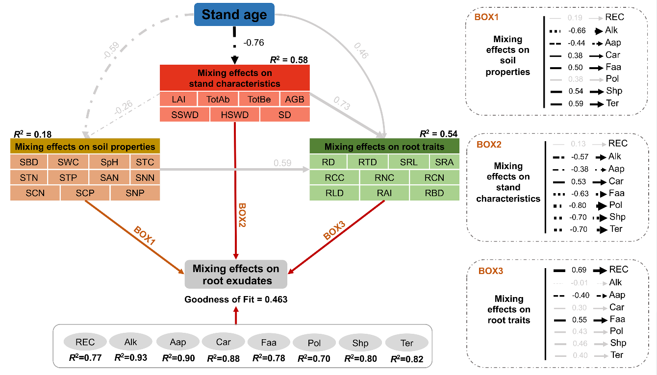 森林管理策略(如树种混合)如何影响根系分泌物,特别是不同林龄阶段分泌物数量和质量的研究仍较为缺乏。基于此,团队选取了4个林龄梯度(25年、36年、46年和63年)的异龄马尾松-红锥混交林及马尾松纯林为研究对象,系统分析了马尾松根系碳分泌速率和分泌物代谢组学特征。通过测定并计算林分特征、根系性状和土壤理化性质等28个因子,以此探讨树种混交下各环境因素与根系分泌物之间的相互作用。
