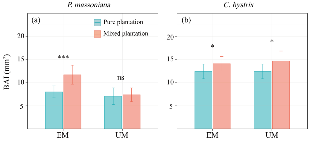 团队采用树木年轮学方法,在个体水平(共286株树木)重建了马尾松(Pinus massoniana)和红锥(Castanopsis hystrix)组成的同龄混交林(EMs)和异龄混交林(UEMs)及其相应的纯林的37年生长序列。结果显示,1)在EMs中,相较于纯林,马尾松和红锥的生长量分别降低20.8%和提高26.2%。然而,在混交的前17年内,马尾松的生长量并未受到显著影响,但在此之后则明显受到红锥的抑制。2)在UEMs中,马尾松与红锥的生长量较其纯林分别下降20.8%和26.2%,但随着混交时间延长,马尾松在混交30年后由受抑制转为受促进。3)UEMs中马尾松的相对生长量随旱季降水量增加而提升。总体而言,异龄混交有助于在长期尺度上促进树木生长,并提高林分应对未来降水变化的适应能力。而对于同龄混交林,应在生长快速且不耐荫的树种经历强烈光竞争之前实施间伐。研究结果以“Tree species mixing effects on the radial growth ofPinus massonianaandCastanopsis hystrix: A comparison between even-aged and uneven-aged stands”为题发表在Forest Ecology and Management(Top期刊,农林科学领域2区)上,研究团队2023级博士研究生陈仁杰为论文第一作者,申卫军教授为论文通讯作者。原文链接:https://doi.org/10.1016/j.foreco.2024.122058