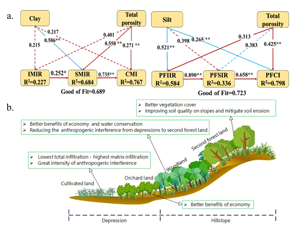 图4 土壤理化性质与基质入渗和优先流的多变量效应分析(图a);喀斯特峰丛洼地中不同土地利用类型的分布策略示意图(图b)。