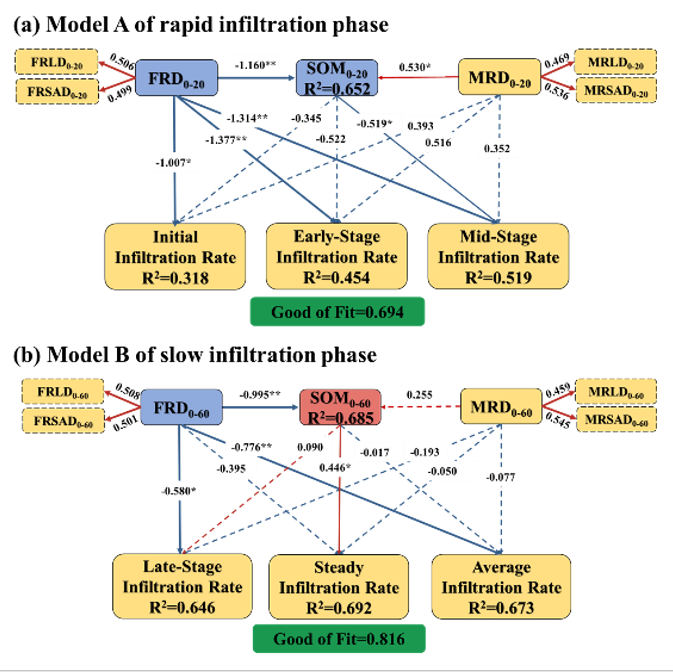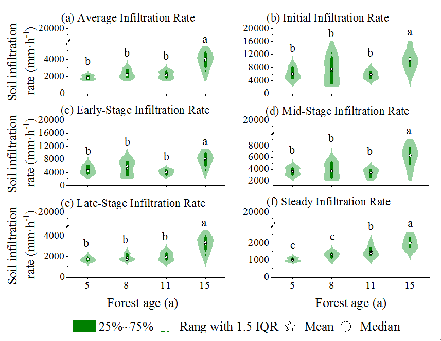 探究土壤入渗是评估人工林纯林生态系统水源涵养保护能力的关键。研究团队采用改进表置式双环入渗仪,对不同林龄(5、8、11和15年生)杉木人工林的土壤总入渗开展了田间试验。结果表明,1)土壤入渗速率随林龄增长呈增大趋势,15年生杉木人工林土壤总入渗显著增大,为更好揭示入渗过程的驱动机制,团队创新性地将土壤入渗过程分为快速(初始、早期和中期入渗阶段)和慢速(后期和稳定入渗阶段)阶段;2)土壤黏粒和粉粒含量是导致不同林龄人工林整个入渗过程存在差异的主要物理因素:黏粒含量增加、粉粒含量减少会提升土壤入渗能力。3)稳定入渗阶段之前,杉木人工林的细根密度是抑制入渗的主要因素;相反,土壤有机质在慢速入渗阶段对入渗表现出促进作用,尤其对稳定入渗速率的促进效果最显著。同时,为提升土壤入渗能力,杉木人工林的轮伐期理想情况下应延长至15年以上。研究结果以“Influence of the root–soil complex on soil infiltration stages and their temporal changes inCunninghamia lanceolataplantations”发表在Geoderma(TOP期刊,农林科学领域1区)上,研究团队生态学2024级硕士研究生容清标为论文第一作者,黄钰涵副教授为论文通讯作者。原文链接:https://doi.org/10.1016/j.geoderma.2025.117606
