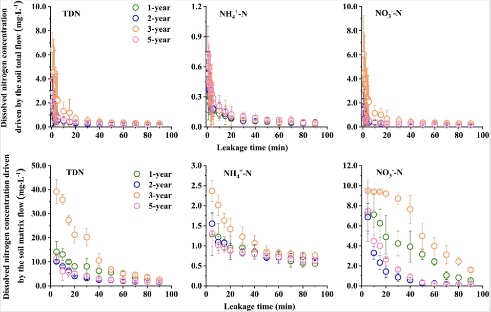 土壤氮素淋失是影响桉树人工林氮肥利用效率和水体环境质量的关键问题。研究团队以短轮伐期1年、2年、3年和5年桉树人工林为对象,采用原状土柱和填充土柱分别模拟土壤总水流(优先流+基质流)和基质流条件下桉树人工林土壤氮淋失过程。研究发现,1)两种入渗路径下的氮淋失均呈现“初期峰值效应”,淋失浓度在入渗初期达到最高,随后逐步稳定,初期高浓度氮淋失可能对水体质量构成潜在威胁。2)土壤总水流的累积入渗量是基质流的23.0~53.1倍,其驱动的总溶解氮(TDN)和硝态氮(NO3--N)淋溶总量显著更高,且氮淋溶量与累积入渗量呈显著线性正相关;而基质流驱动的氮淋溶量与累积入渗量呈现“解耦”关系,主要因基质流能快速耗尽土壤中可溶态氮,后续入渗水难以进一步促进氮素淋出。3)土壤总流的氮淋溶总量更大,但从淋溶浓度和强度来看,基质流对氮素的淋溶效应更为突出。研究成果以“Soil nitrogen leaching driven by different soil infiltration pathways: A simulated study in eucalyptusurophylla×E. Grandisplantation”发表在Journal of Hydrology(Top期刊,水文领域1区),黄钰涵副教授为第一作者,北京林业大学余新晓教授为通讯作者。原文链接: