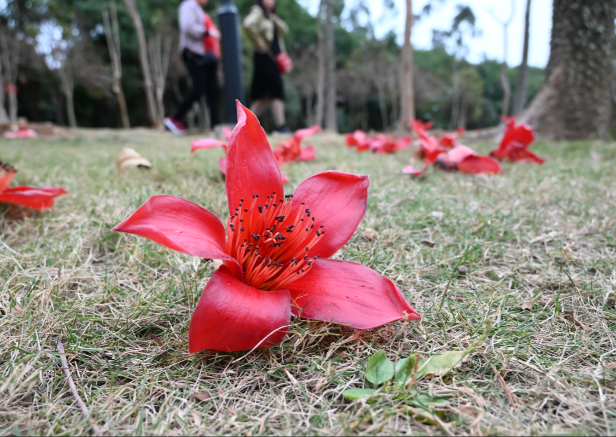 木棉最令人惊叹的是其壮观的花期。每年3-4月,光秃的枝头会绽放出直径约10厘米的硕大花朵,花瓣5枚,肉质,呈鲜红色或橙红色,有时也会出现罕见的黄色变种。花朵簇生于枝端,盛开时整棵树如同燃烧的火炬,蔚为壮观。这种先花后叶的特性使木棉花格外醒目,成为南国春天最耀眼的风景。